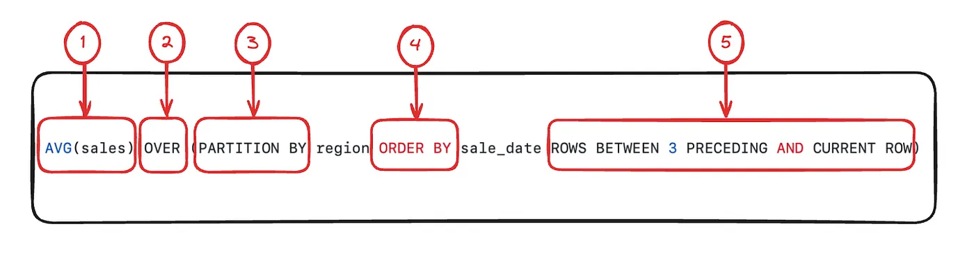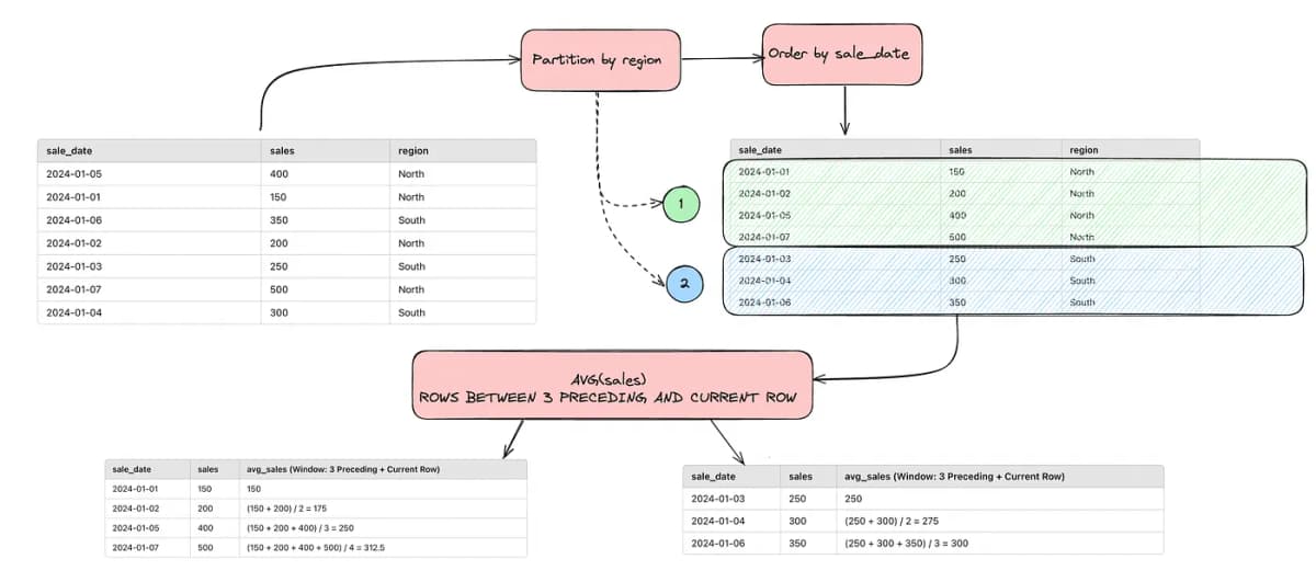 In this example, the function AVG(sales) OVER (PARTITION BY region ORDER BY sale_date ROWS BETWEEN 3 PRECEDING AND CURRENT ROW) calculates the average of sales over the previous three rows as well as the current row, for each region, while respecting the chronological order of the sale dates.