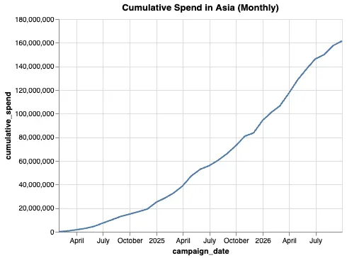To analyze the performance of spending by region, we can use the SUM() OVER function to calculate the cumulative spend over time in each region.
